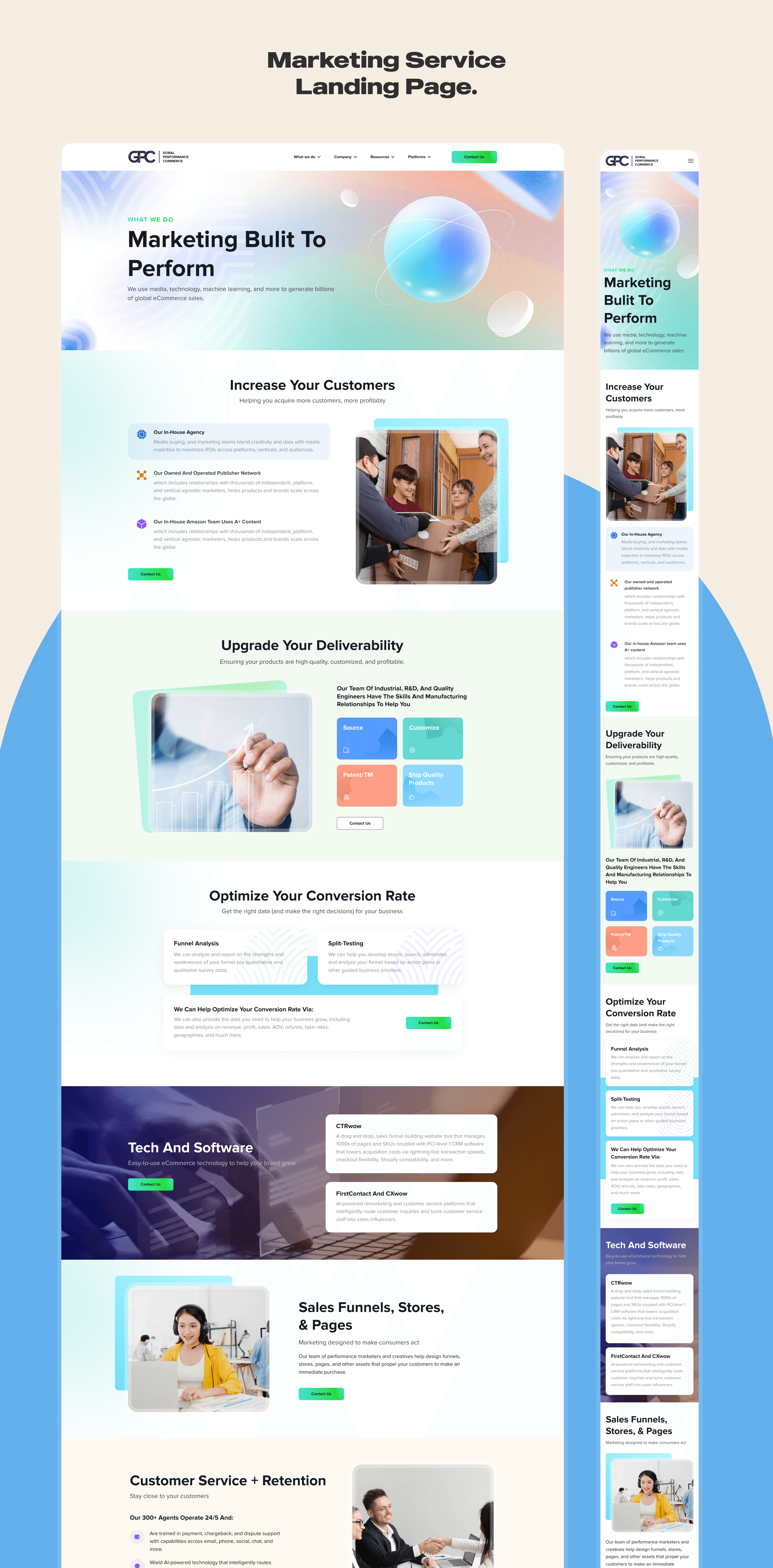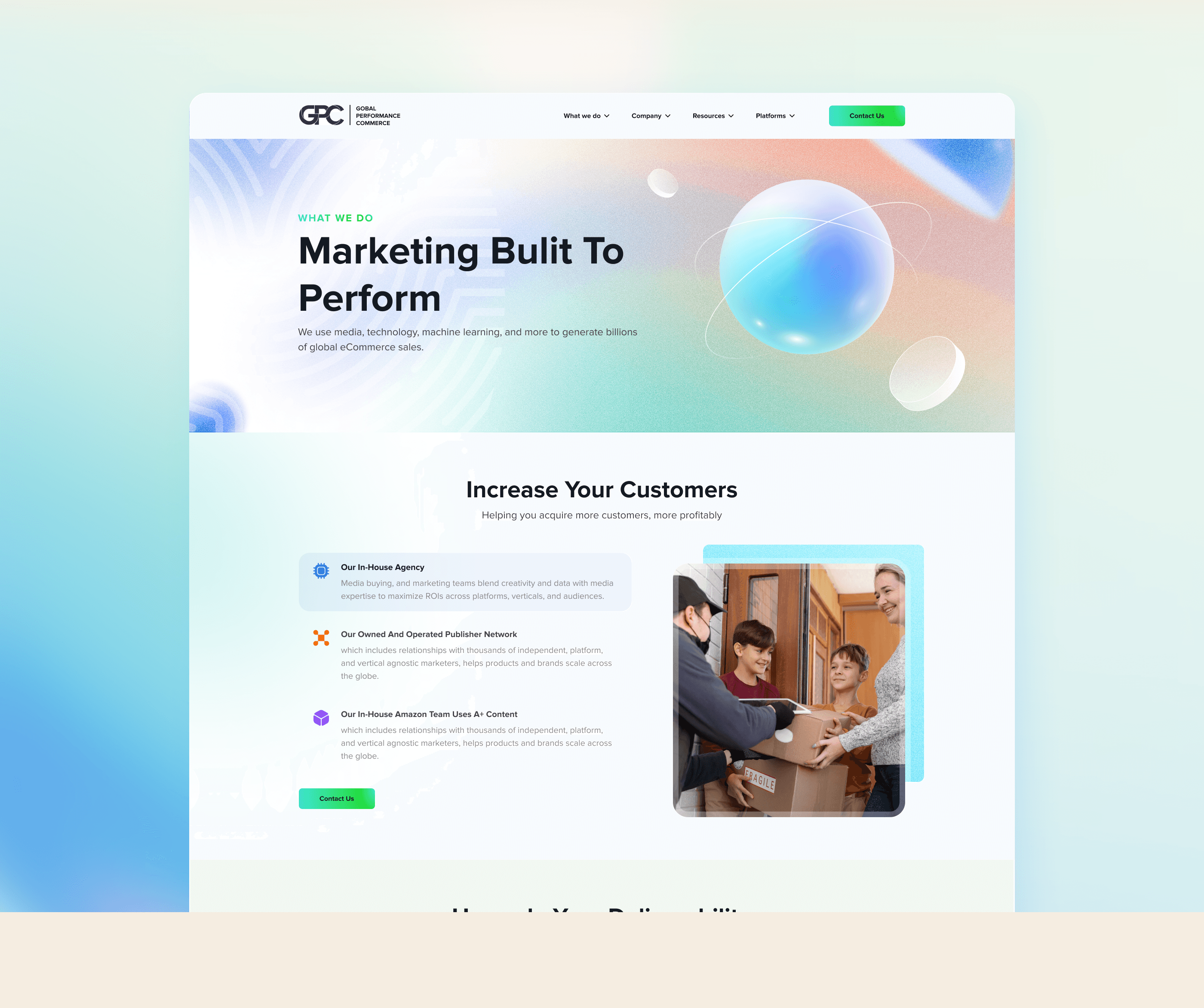 Landing page introducing the services of providing high performance marketing solutions for global e-commerce.